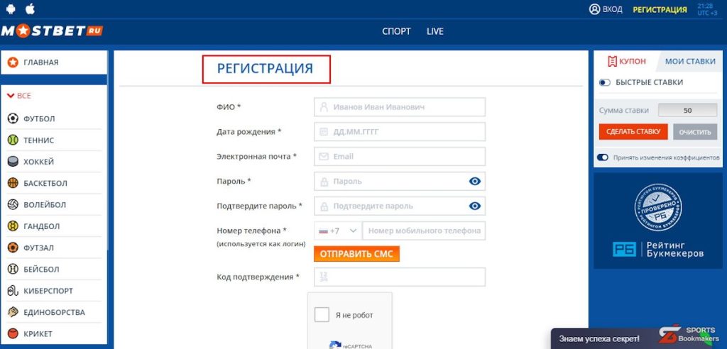 • вход в личный кабинет с сохранением всех данных и истории ставок,